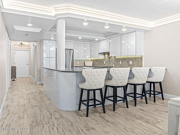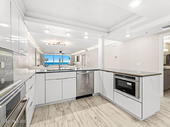 Modern 3rd-floor beauty showcasing knockout oceanfront views & chic interior style! Crown-molded ceilings & wood-look tile floors span the unit, outlining generous open living & dining areas. A triple slider leads to the spacious balcony & bodacious beachside vistas. Stone counters & a stunning micro-tiled backsplash cascade across the contemporary kitchen accented w/sleek Bosch SS appliances, glossy white cabinetry w/under-mount lighting & a wine fridge. Personal balcony access, a custom walk-in closet & a luxury bath create a cushy primary suite. Double sinks, a lovely stand-alone tub & a tiled shower w/dual heads & bench seating are designed to impress! The condo's laundry rm is useful after a day at the beach. Enjoy the community pool, clubhouse & resident-only ocean entry!