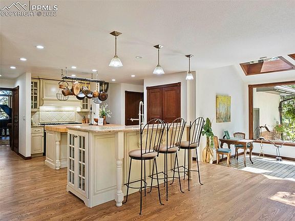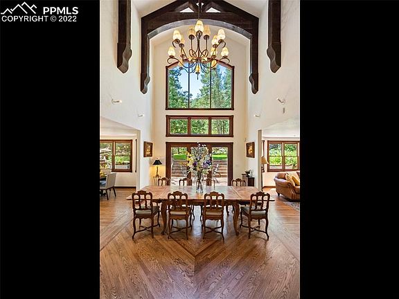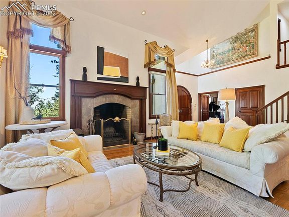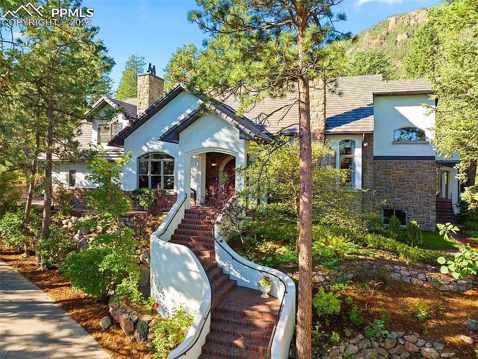 Tucked away on a full acre in the trees, this completely custom Colorado castle is not only private and serene, but also less than a mile from the dining, activities, and amenities of the iconic Broadmoor Hotel * QUALITY ABOUNDS * NEW private wrought iron electric gate plus front fencing adds to the sense of arrival and provides peace of mind * Heated driveway + bonus parking for guests next to brick entry with stucco wall * Soaring ceilings with cathedral timbers showcase the wall of windows that show the towering trees – bringing the outside in * Front gleaming hardwood floors with inlaid accents * Very rare MAHOGANY doors, trim, casements, and baseboards – all newly refinished * Spacious five-piece master suite with beautiful bay window, fireplace, and private covered balcony * Light and bright kitchen with custom WoodHarbor cabinetry, immaculate butcher block island and breakfast bar + professional ICE MAKER, Viking stove, and Thermador hood * Fully fenced back yard oasis with brick paver patio leading to lush green sod and newly landscaped granite boulders + new trees, flowers, and waterfall / water feature * Dramatic solarium just off of kitchen for growing herbs and indoor plants/trees * Completely covered lanai-style space for relaxing in any weather or adding hot tub * Fun and functional lower level with wet bar and SubZero fridge plus movie theater * NEW hail-resistant tile roof and gutters * Dedicated office with built-ins * NEW paint inside and out including elastomeric exterior * Cheyenne Mountain D12 schools – number one out of 178 public school districts in Colorado – plus close to private Colorado Springs School * Just a few minutes from the Cheyenne Mountain Zoo, The Broadmoor Hotel, and hiking trails at Stratton Open Space * Views of the twinkling downtown city views plus front range mountains, the Broadmoor Hotel & the shrine