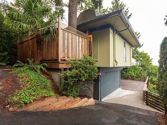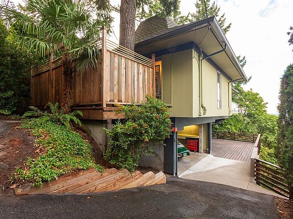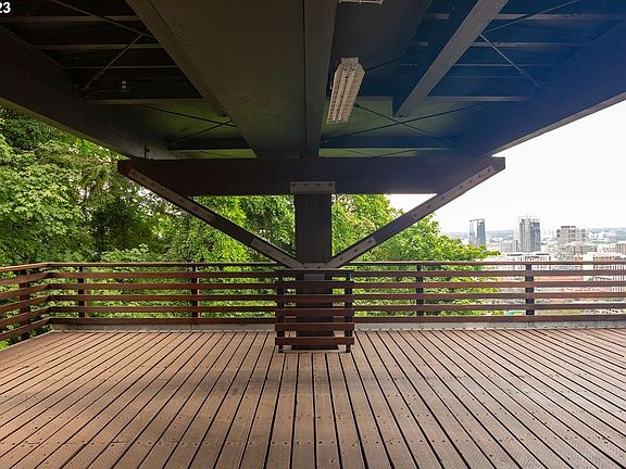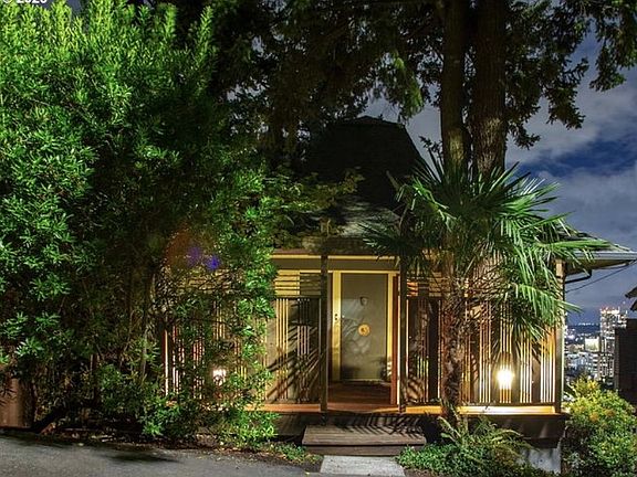 Featured in NY Times, Pagoda in the Sky! Architect designed and engineered, OUTSTANDING Mt. Hood & panoramic city & mntn views. Living room appears like a floating glass box w/15 foot pyramid ceiling. Inventive design w/moorish archways, bamboo flrs, one bedrm, bath, den/ofc w/contemporary gas fplc, dining room opens to wrap around deck for entertaining views. Just right minimalist kit w/Viking range & pull down access to pyramid ceilinged storage attic. Down under you will discover enclosed garage w/commercial overhead steel door, PLUS recent addition of 720sf covered cantilevered steel/wood parking platform that sports stunning views! Over engineered to hold 3 cars, potential to transform & glass-in for thrilling creative space, home gym w/boxing ring, art studio? Let your imagination soar. This unique jewel of a home is ideal for artists of all stripes craving the not-so-big-house, stand alone condo alternative, or stunning pied-a-terre. Finally a home as unique as you! Close to City life, OHSU, PSU, yet an oasis of welcomed privacy.