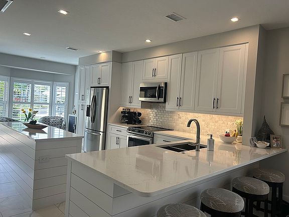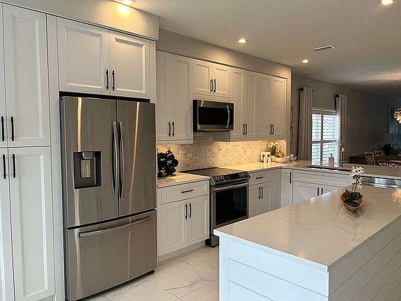A new tile roof and paver driveway in 2018. Hurricane impact windows in 2021. 16 x 16 full view screen enclosure with stamped concrete deck in 2022. Two stall garage with epoxy floor. 200 amp electrical service that is wired with a 50 amp plug for a generator in 2021. The bright interior has a spacious open concept with 9’ ceilings. New kitchen with 42” white wood cabinetry, quartz counters, Samsung stainless steel appliances and bar area. A spacious master bedroom and guest en suite with both baths having new cabinetry, quartz countertops, Porcelain walk-in showers and frameless glass shower enclosures. The beautiful Great room hosts a shiplap feature wall with built-in 75” TV and 74” Dimplex LED electric fireplace. All new LED lighting, fixtures and fans throughout and beautiful 24 x 24 white Carrera porcelain flooring.