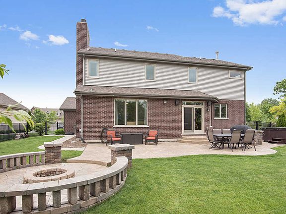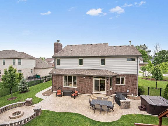 GORGEOUS Breckenridge model home in the popular Creekside Estates South. The elegant stone and brick facade, relaxing front porch and professionally landscaped yard provide this home with excellent curb appeal. As you enter this lovely home you will notice a bright, airy and open feel in the large, two story front room with gleaming hardwood floors, white trim and neutral colors throughout. The open concept kitchen and dining area with custom cabinets and stainless appliances makes it easy to keep an eye on what is happening in the back yard or family room. Upstairs in the enormous master suite you will find two huge walk in closets and a gorgeous master bath with separate tiled shower and deep soaking tub. There is also a large, full, unfinished basement with plumbing roughed in for an additional bathroom. The newer patio door with transom leads out to a custom, stamped concrete patio with built in fire pit, grill enclosure, huge hot tub and a lovely fenced yard. This home has it all!