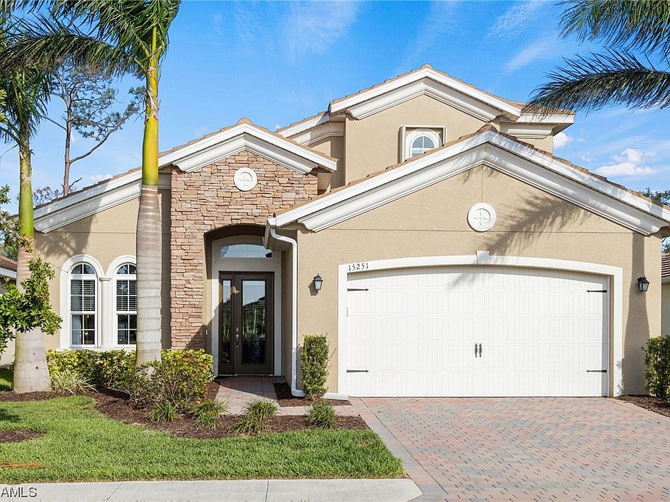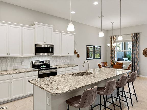 Introducing the ultimate luxury living experience in the highly sought-after Venetian Pointe community. This stunning 3 bedroom, 3 bathroom, + den home boasts modern features and high-end finishes throughout. As you step inside, you'll immediately notice the solar-tinted windows that not only provide an added layer of privacy but also help to keep the home cool and energy-efficient. The large granite kitchen island is perfect for entertaining and the stainless steel appliances make meal prep a breeze. The primary bedroom is the ultimate retreat, featuring a large bathroom with dual sinks, a walk-in shower, and a separate tub. Soak up the sun and relax by the resort-style pool in your backyard. Special features: luxury carpeting in the bedrooms, crown molding on the kitchen cabinets, and a loft upstairs that can be used as a game room or additional living space. This low HOA community also offers a fitness center and clubhouse. Location is key and this home is perfectly situated just minutes away from the SW Florida Regional Airport, shopping, medical facilities, Lakes Park, and beautiful beaches. Schedule a viewing today and discover your own private oasis in the heart of paradise.