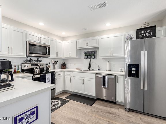 Luxury in a Gated community ~ Village North luxury condos! This stunning ground-floor-condo is one of the larger models with major upgrades!! Relax and unwind with a rare 2 screened covered patios. White SHAKER cabinetry, QUARTZ countertops, and modern cabinet hardware make an impressive impact in the kitchen and bathrooms which add to the luxury-timeless feel. STAINLESS STEEL appliances! The primary suite boasts a walk-in closet, dual sinks, and a newly tiled walk-in shower, while the guest bedroom has access to a hall full-bath with a QUARTZ SLAB shower taking center stage! In-suite laundry, WASHER|DRYER stays! This gated community offers multiple pools, spas, easy access to shopping, dining, schools, golf and freeways!