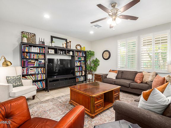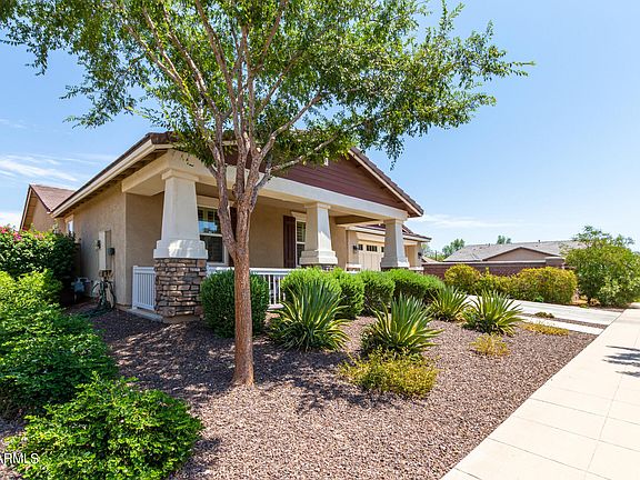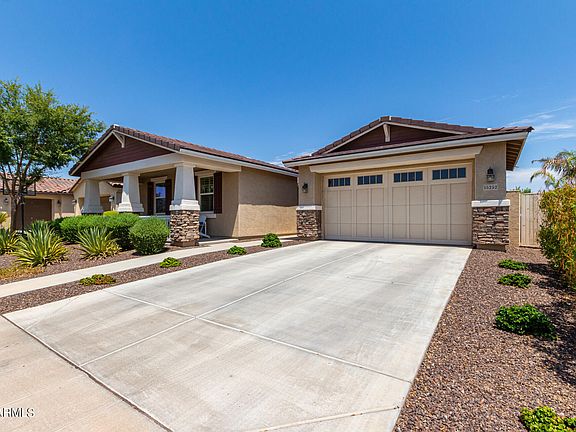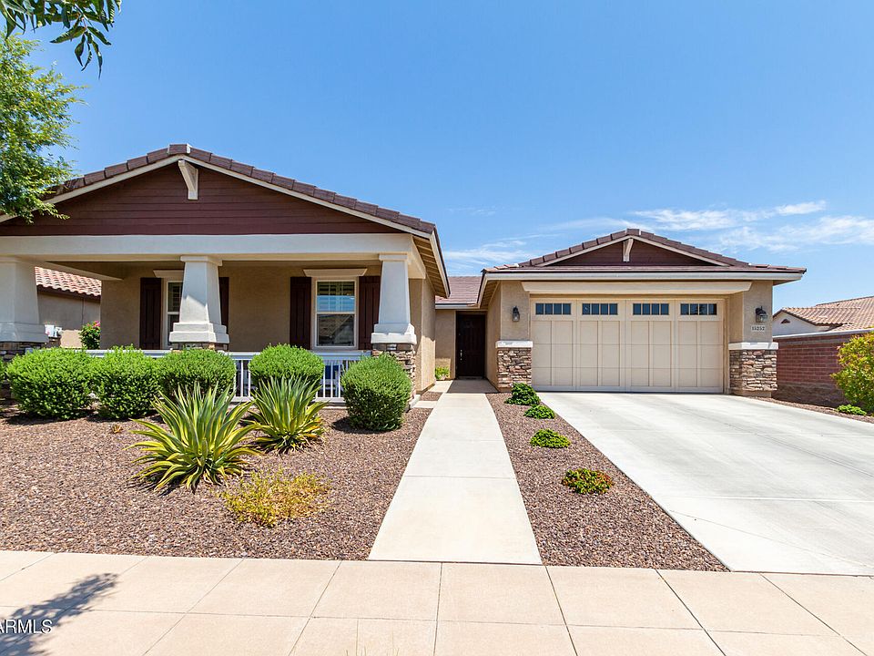 Pride of ownership is shown in this remarkable property nestled in Marley Park! Prepare to be impressed by a bright, spacious open floor showcasing neutral tile flooring, a soothing color palette, plantation shutters, & sliding doors merging the indoor with the outdoor living. The gorgeous chef's kitchen is a cook's delight, offering chocolate-stained cabinets adorned with crown moulding, granite counters, SS appliances, double wall oven, a subway tile backsplash, a walk-in pantry, & a center island including a breakfast bar. The primary bedroom boasts plush carpet in all the right places, a walk-in closet, & a private bathroom with dual sinks. You'll love hosting fun gatherings in the fabulous backyard, featuring a manicured landscape & covered/open patios! This gem won't disappoint!