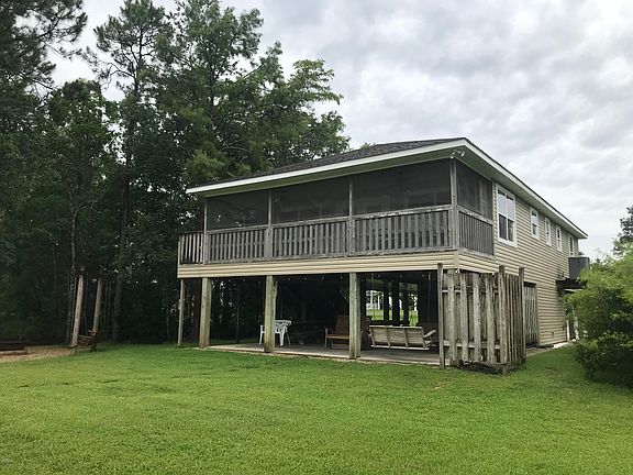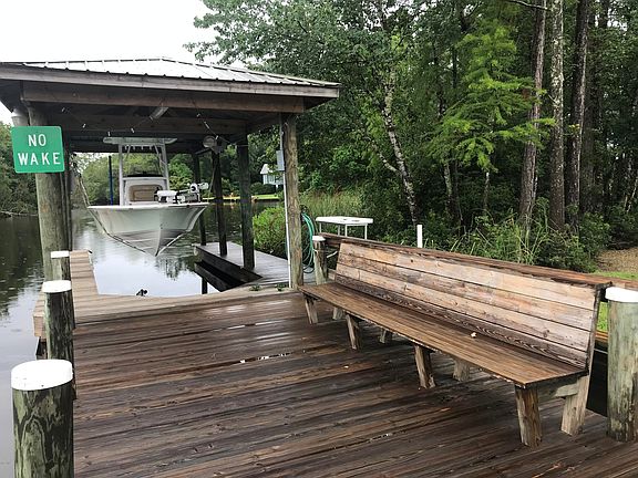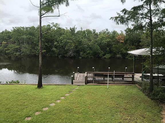 Perfect Stay-cation Riverfront Home! This water lovers retreat is just off the Jourdan River on Bayou Talla and it would great for a full time home or family getaway. Details includes ship-lapped walls, pine floors, crown molding, an open floor plan for entertaining, kitchen island, dining area, Master bedroom has a beautiful custom refurbished shutter headboard, walk in closet and private bath. Both guest rooms have built in bunk beds which could be modified into closets. Outdoor amenities included and upper screened in patio, graveled stone fire-pit area, patio entertainment area underneath home, storage area with bathroom and utility sink, bulk-headed waterfront with dock, fish-cleaning station, sitting bench and boat house. Dock and boat house built in 2011.