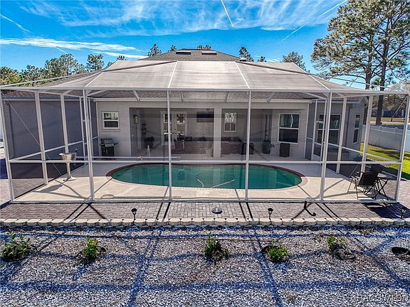 Welcome to Oakwood Acres, where the essence of Florida living meets timeless elegance. This meticulously maintained custom-built home is truly one of a kind. Offering 5 bedrooms, 3 full bathrooms, complete with an office, this stunning home offers 3,400 square feet of beautifully designed living space on a generous 1-acre lot with agricultural zoning combining the tranquility of country living with modern conveniences. The split floor plan features a large formal dining room with tray ceilings, and a chef's kitchen complete with granite countertops, stainless steel appliances, a spacious walk-in pantry, abundant cabinetry, and a kitchen island with additional storage and workspace. The kitchen sink includes a reverse osmosis system, ensuring clean, fresh water. A spacious laundry room offers a new washer and dryer, plentiful cabinets, ample counter space, and a stainless-steel utility sink. The primary suite is a luxurious retreat with 10-foot ceilings, two large walk-in closets, a spa-like bathroom which is currently being updated, granite countertops, dual sinks, a walk-in shower, and a whirlpool bathtub. The home has been freshly painted inside and out and showcases elegant crown molding and porcelain tile flooring throughout. Step outside to a scenic, tree-lined, fenced backyard that includes a spacious 10x20 insulated shed, a 24x40 brand new pole barn, an attached two car garage, a screened lanai with an in-ground pool, perfect for relaxing and enjoying nature. Recent updates include a new roof (2024), new A/C (2024), hurricane windows and doors (2022), new porcelain floors (2021 & 2024), and a new microwave (2021). The home is protected by a Choice Home Warranty through 2028. Located less than five minutes from the Suncoast Parkway, this property offers a prime location with easy access to Tampa International Airport, hospitals, restaurants, and shopping. Enjoy nearby Hernando Beach and the Gulf, all just minutes away. Schedule your showing today!
