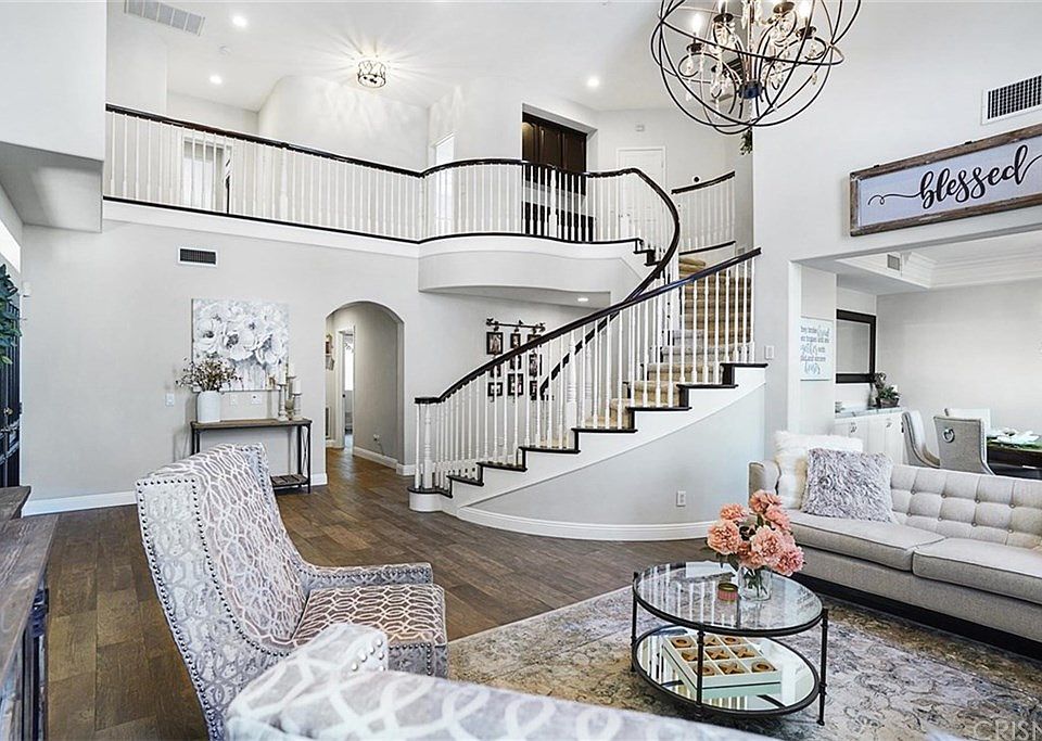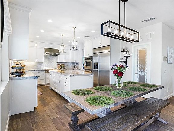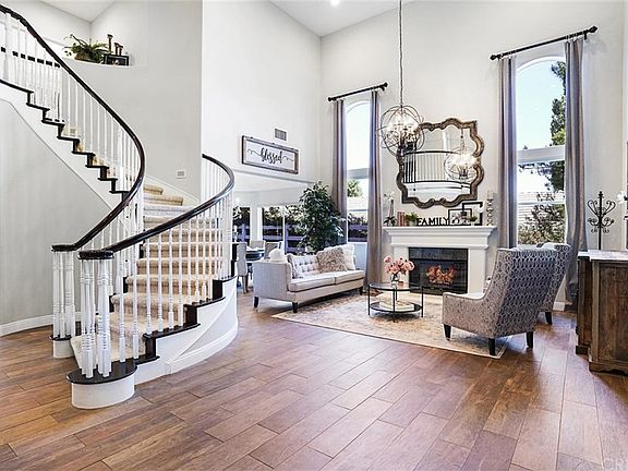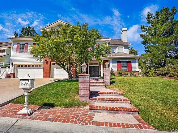 Absolutely gorgeous Sand Canyon home with detached guest house! No detail has been spared in this stunning home. The entry offers soaring ceilings and spiral staircase, wood-like tile flooring throughout the downstairs. The formal living room with fireplace, custom drapery and chandelier is open to the formal dining room with Quartzite buffet area. There is a charming office or art/craft area in the front of the home. The kitchen is breathtaking with Quartzite countertops, white cabinetry, walk-in pantry, Viking gas range and double oven, and GE Monogram built-in refrigerator. The kitchen opens to an additional dining area and the spacious family room with fireplace and reading nook. Downstairs you will also find a half bath, and a complete downstairs suite with full bath, walk-in closet and laundry area. Upstairs, the vast master suite offers a retreat area and luxurious master bath with soaking jetted tub, separate shower, and dual marble vanities. There are 3 additional bedrooms and 2 full baths upstairs. Outside, you will find a covered patio area, built-in barbecue, vegetable garden, private pool with beach entry, slide and waterfall, an outdoor shower and sport court. The detached guest house is wired for sound studio capabilities and is currently used as a home theater with additional 1 bedroom, full bathroom and kitchen area. OWNED SOLAR! This incredible property is located on a quiet cul-de-sac in the desirable community of Sand Canyon.