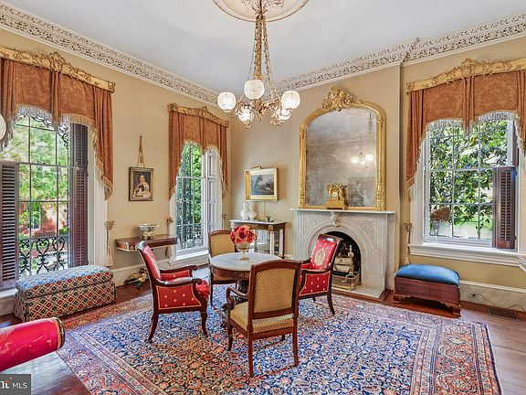 The Alexander Graham Bell House | Step into a Gilded Age fantasy with this extraordinary Italianate corner residence, built in 1854 and once home to Alexander Graham Bell and his family. Steeped in history and architectural splendor, this six-bedroom, six full and two half-bath Georgetown estate is a masterwork of 19th-century elegance, meticulously preserved and thoughtfully updated. A Grand Historic Interior Spanning four gracious levels, the home is centered around a sweeping mahogany staircase rising beneath a stained-glass skylight. Echoes of Upstairs/Downstairs living abound—from working call bells connecting principal rooms to the kitchen, to grapevine and acanthus-leaf moldings, faux bois doors, paneled window shutters, and intricate brass hardware. The twin parlors—perfect for formal entertaining—feature marble fireplaces with carved acorn details, gilded crown moldings and chandelier medallions. Stained-glass pocket doors lead into the formal dining room, where striped wood floors extend into a ballroom-like space framed by Palladian triple-hung windows that open to the terrace garden and fountain. Period chandeliers, cut-crystal sconces, and etched glass fixtures complete the unified decorative scheme. The main level half-bath features an antique Edward Johns & Co sink, period high-tank commode, and opaline glass light fixtures. Chef’s Kitchen & Terraced Garden The light-filled, eat-in kitchen blends historic charm with modern functionality. Anchored by a wood-burning fireplace, it includes Wolf and Sub-Zero appliances, a mix of butcher block and stone counters, and fully functional original call bells. French doors open directly to the lush, walled terrace garden—an urban sanctuary complete with mature plantings and a stone fountain. Private Quarters & Lavish Suites The original second-floor primary bedroom is bathed in natural light and adjoins a marble-and-tile ensuite bath with Waterworks fixtures and a towel warmer. A nearby study/library features a marble fireplace and access to a canopied terrace, as well as a concealed Eastlake-style wet bar outfitted with a copper sink, pomegranate-motif painted tiles, and herringbone cabinetry. A later addition brings a private octagonal primary suite enhanced with opaline glass tiebacks, floral plaster medallion, and dual bathrooms. One features a marble sink, tile shower, and Waterworks fittings; the other offers a large marble vanity within a spacious dressing room, complete with a built-in ironing station and Jacuzzi tub. On the third floor, two additional bedrooms each offer marble fireplaces, custom built-ins, and full ensuite baths with clawfoot tubs, pedestal sinks, and antique light fixtures. Lower Level Accessible via private staircases, the fully equipped lower level includes a two-bedroom in-law or rental suite with twin closets, a full and half bath, and a dedicated laundry. Period elements abound: original tile floors, a Dutch door, cast-iron hardware, and tongue-and-groove detailing. The historic butler’s pantry and second laundry station add charm and functionality. Additional Features Include: Oversized two-car garage with ample storage and recent improvements Copper flashing and drainage throughout Original enamel doorknobs, locks, and fixtures throughout Multiple fireplaces, including wood-burning and decorative marble Thoughtful updates with Waterworks, Lefroy Brooks, and Czech & Speake fixtures A Rare Opportunity Located within the Georgetown Historic District and listed on the D.C. Inventory of Historic Sites, the Alexander Melville Bell House represents an extraordinary convergence of heritage, craftsmanship, and luxury. It is not merely a home—it is a legacy, ready for its next steward.