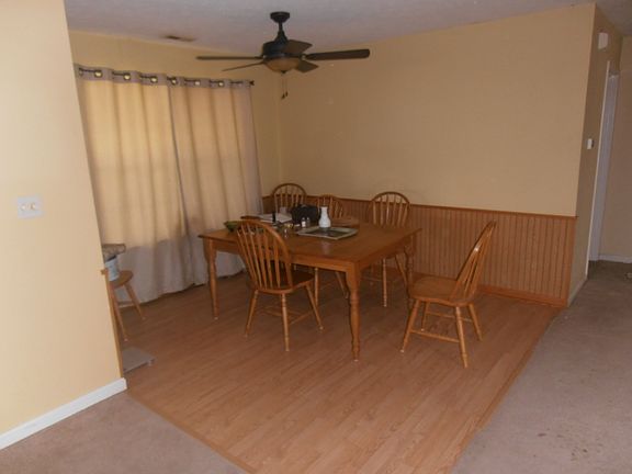 Great floor plan with eat in kitchen and breakfast bar, laundry closet off kitchen. Split floor plan with private primary bedroom. Newer 1 layer roof, furnace, C/A and garage door. Rear yard has full wood privacy fence. Dining room has laminate flooring and is open to Great Room.