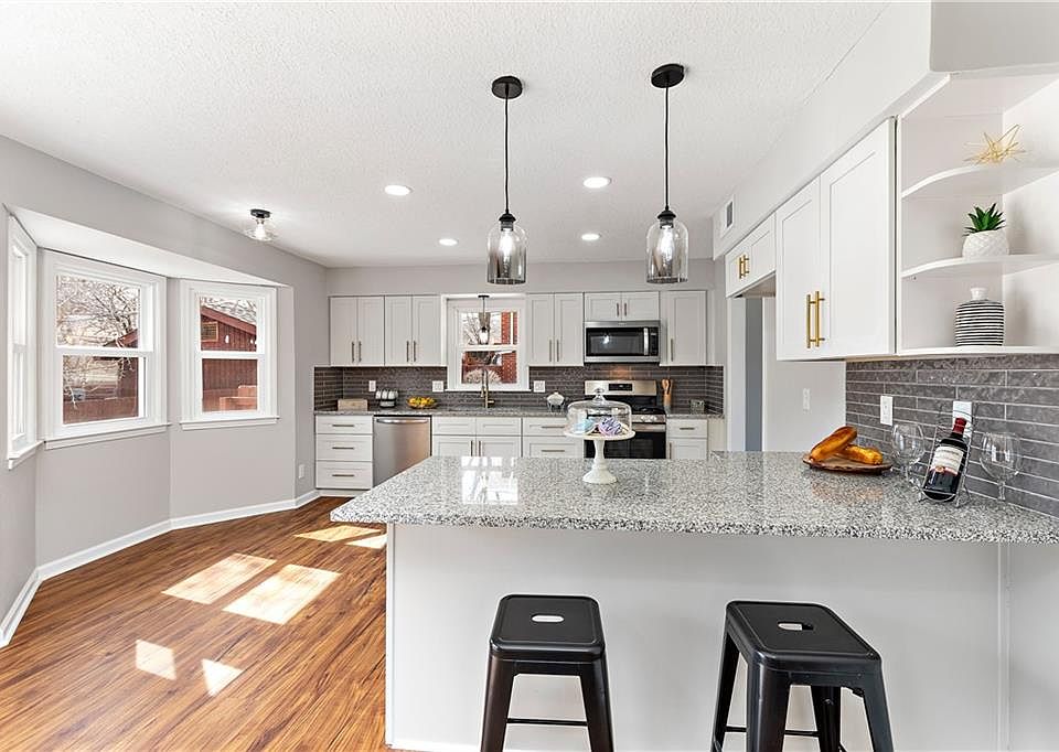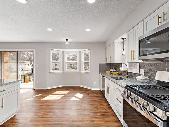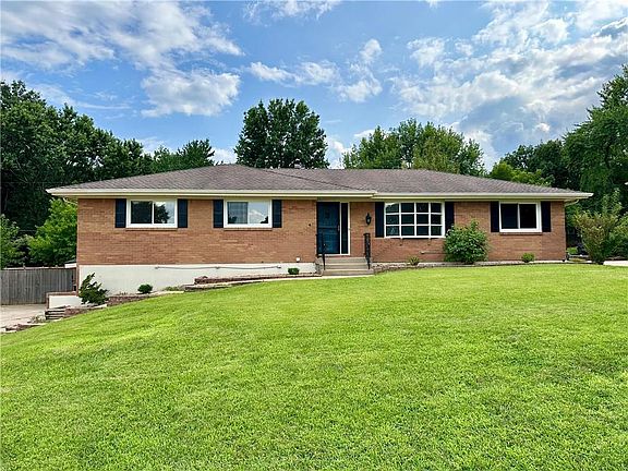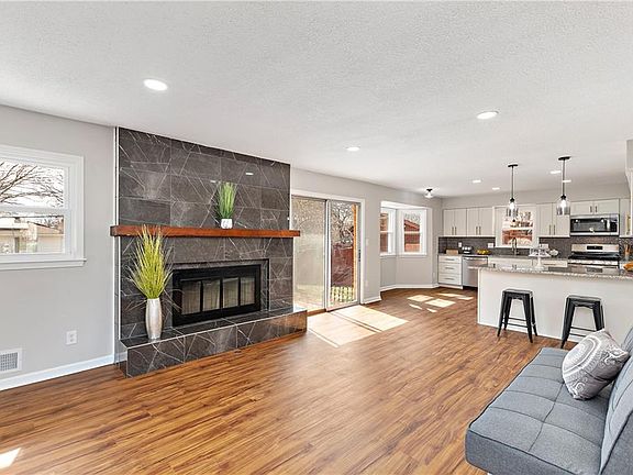 Offer deadline is Sat, 9-17-24, 4pm. Welcome home to this beautifully remodeled 3-bedroom, 3-bathroom ranch with a stunning walk-out basement! The basement features a full separate living quarters, including a kitchen, family room with a wood-burning fireplace, a 4th non-conforming bedroom, a bathroom with an XL Jacuzzi tub, a dining or office area, and a laundry room. The spacious main level boasts a beautiful eat-in kitchen with an island, quartz countertops and stainless steel appliances adjacent to a cozy fireplace and dining room. Also on the main level is a master suite with a tiled shower, two additional bedrooms, and another full bath also featuring luxury vinyl plank flooring and tile. Perfect for entertaining, this home offers three living areas, a large double pad driveway, and a generous patio area in the fenced, flat backyard with a 15x20 storage shed. The yard includes a variety of mature fruit trees (apple, pear, peach, cherry, fig) as well as flowers and shrubs. The exterior is maintenance-free with all-brick siding. The soffit, fascia, and windows are all wrapped. Oak Grove Park, with its trail, playground, and amphitheater, is within walking distance. Located in the highly rated NKC School District.