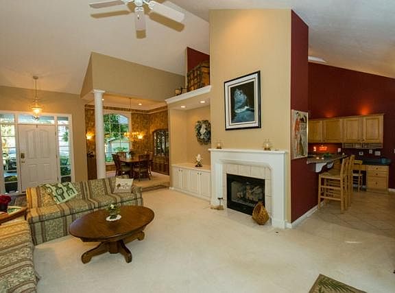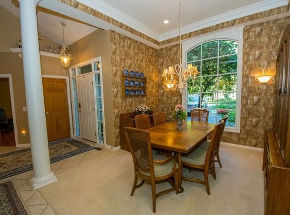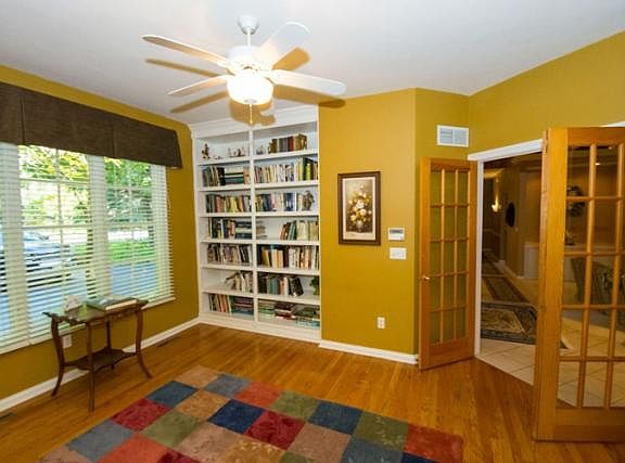 Elegant former showcase home in the coveted Forest neighborhood. Flowing open floor plan with many windows and skylights for much natural light and views of beautiful exterior. Vaulted great room with built-ins and gas fireplace perfect for entertaining. French doors lead you into a cozy den with built-ins and hardwood flooring. Gorgeous dining room with 11ft. tray ceiling and upgraded light sconces and chandelier. Spacious eat-in kitchen featuring a vaulted ceiling, and 2 skylights along with some new appliances, and a granite breakfast bar. Master bedroom with en suite including dual vanities, garden tub and large walk-in closet. 2nd floor offers 3rd bedroom or flex room along with walk-in attic. Outside enjoy relaxing to the peaceful sounds of the waterfall in the beautiful serene backyard. Roof and overhead garage door installed 2008. New master bedroom carpet and refrigerator and built-in microwave. Includes 13 month Home Warranty.