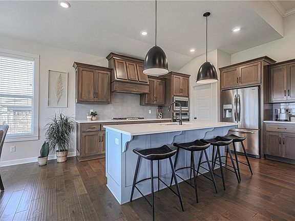 Welcome to this impeccably maintained 1.5-story home featuring the Valentia floor plan by Summit Homes—a layout that’s no longer available and highly coveted for its versatility and design. The heart of the home is the stunning kitchen, designed for both everyday living and entertaining. It boasts a large island with seating, quartz countertops, stainless steel appliances, a walk-in pantry, custom cabinetry, and designer lighting, offering both function and style. Just off the entry, a flexible front room provides the perfect space for a dedicated home office or formal dining area, depending on your needs. The great room features soaring ceilings and a floor-to-ceiling stone fireplace that adds warmth and character, all flowing seamlessly to the covered patio and fenced backyard, ideal for outdoor entertaining or peaceful evenings at home. The main-level primary suite is a true retreat with a spa-like bathroom that includes a beautifully tiled shower, luxurious soaking tub, and a spacious walk-in closet conveniently connected to the laundry room and mudroom. Upstairs offers three spacious bedrooms. Two are connected by a Jack-and-Jill bath, while the third enjoys a private en suite with a large walk-in closet. The finished lower level expands your living space with a wet bar, surround sound for movie nights, a fitness area, and a fifth bedroom with a large walk-in closet, perfect for guests or extended family. Located in one of Lee’s Summit’s most desirable neighborhoods, you’ll enjoy access to incredible amenities: a competition-size 4-lane pool with reef and kiddie areas, clubhouse, playground, and trash/recycling services. All just minutes from top-rated Lee’s Summit schools, shopping, dining, and parks. This is the one you’ve been waiting for—don’t miss the opportunity to own a truly rare and well-cared-for home!