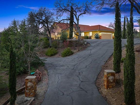 Just in time for spring is this single level 4BR, 2BA charmer featuring a combination of Tuscan style and comfort that blend together nicely. Be prepared to be impressed! Home sits atop an upslope private blacktop driveway surrounded by 2.8 acres landscaped with oak, pine, cedar and cypress trees spread across the property. Inside you will find an open concept living area with lovely views of the rolling hills. Off the living room is a formal dining room, kitchen features tile floors, oak cabinets & granite countertops including a breakfast bar. The bedrooms are roomy and nicely situated, primary bedroom with ensuite features an additional sitting room/office. The indoor laundry has a good sized storage closet/pantry, a sink and plenty of cabinets. Step out back with added excitement as you take in the views and entertainer's patio where gatherings are sure to take place while admiring the stunning sunsets under the foothill stars. This home shows meticulous care and ownership comes with many community amenities, including use of Lake Tulloch boat launch & boat slips, recreational day use beach, picnic & bbq facilities, Blackcreek park, playgrounds & clubhouse plus miles of equestrian trails. If you enjoy golfing head on over to popular Copper Valley, it's just minutes away or enjoy a day at the Town Square where you'll find dining, shopping, wine tasting, entertainment events, there's even medical service's available. Less then an hour drive to the central valley. Come take a look, this one won't last long