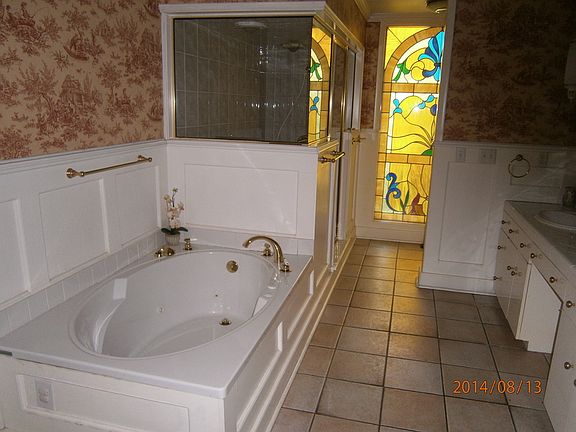 SEE WORTHY! Enjoy the luxury of large-sized rooms, attention to detail, soaring pickled wood ceilings, indoor and out door fireplace, custom stained glass and more! Master bedroom has his/her walk in closets. This home is perfect for entertaining- indoors and outdoors. Indoors-full basement with entertainment center and full kitchen area. Outdoors-patio, pool and play area, surrounded by curving brick retaining walls and beautiful wrought iron detailing.