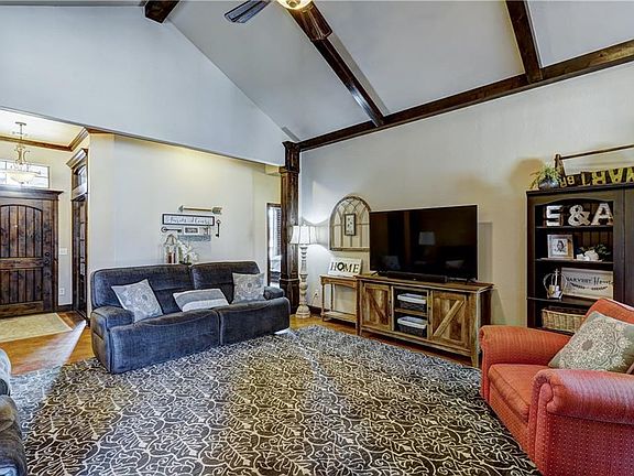 Beautiful home! So many updates and extras you won't want to look any further. The floor plan doesn't disappoint either. So much room and so much storage and no space wasted. Living room is spacious with a beautiful brick fireplace from floor to vaulted ceiling. The extra wood touches are ceiling beam, encased doors, plantation shutters in the front, 6" crown molding and more. Kitchen has plenty of counter space/storage and features professional series appliances. Window treatments are custom made and stay with the home. Laundry room has a dedicated space so its not in sight when guests enter the home. Lots of natural light in living room/kitchen area and bedrooms. Master bedroom is perfect for large furniture, has large walk in closets and a private master bath. Covered back patio is a great space for entertaining. The oversized lot allows for a great backyard with an above ground pool and chicken coop. Garage has a storm shelter, sink and shelving. Full yard sprinkler system.