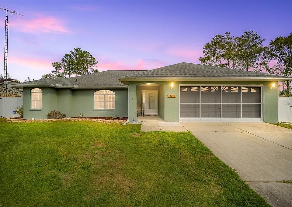 You'll feel lucky coming home everyday to your new home complete with a built in swimming pool! Centrally located Marion Oaks 3/2/2 with lots of stylish upgrades. Freshly painted exterior will greet you, with a cute and functional light post in the front yard. Cathedral ceilings, eat in dining, with bonus space for office or formal dining if desired. No carpet here. New shaker front kitchen cabinets, with beautiful new granite countertops, new sink with filtered water spout and a full sized pantry. Counters for miles, will give you plenty of space to spread out and prepare meals together. All appliances stay with the home. You'll enjoy the aesthetics of the home such as the updated master bath. It has clever newly converted storage space with on trend sliding barn door closure. Pretty cabinetry and granite counters and a walk in closet! 6 panel doors through the home. Main living areas freshly painted. The massive 14x28 sparkling pool has a built-in bench along the width of the pool. Energy saving pool pump too. Covered patio with ceiling fans and outdoor sink for snacks and refreshments. The entire pool deck has been coated and also has a very nice pool cage. Entire yard is fenced with a sharp 6 foot vinyl privacy fence. On demand tankless water heater. There are two sheds in the backyard for convenient storage, the larger shed also has power. Let's not forget the RV pad. Great for storing your own RV or hosting friends while visiting. There is a whole house water softening system that conveys. It is hard to find a home that has been this lovingly upgraded and maintained. Make an appointment to tour asap, you're going to love it! *Roof 6 years old *HVAC A/C 1 year old *Hot Water Heater 1 year old *Whole home water softener *Energy saving pool pump