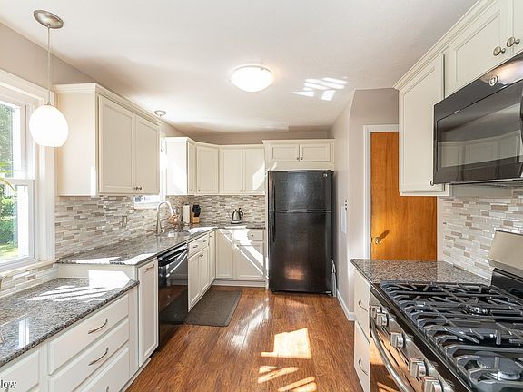 Move right into this well cared for & tastefully updated 3 bedroom 1 1/2 bath colonial conveniently located on a quiet street. Enter through the front foyer into the living room with coved ceiling, large picture window, hardwood floors & gas fireplace. Prepare a meal in the renovated kitchen featuring quality built soft close cabinets/drawers, granite counters, tile backsplash & all kitchen appliances: gas range with air fryer & convection settings 2022, refrigerator, microwave, dishwasher 2022, garbage disposal. The formal dining room has a built-in cabinet coved ceiling & access to sun porch. A first floor 1/2 bath & access to attached garage complete the main level. Head upstairs to 3 generously sized bedrooms, two of them complete with dual closets & one with access to balcony overlooking the fenced yard & paver patio. The 2nd floor full bath has been updated with newer fixtures & Bath Fitter tub. The lower level has a cozy rec room with a 2nd gas fireplace. Additional features & updates include: vinyl siding, vinyl windows, complete tear-off roof 2011, H2O tank 2020, high efficiency furnace & AC installed may 2017, AprilAire humidifier, updated breaker panels, newer 10x12 storage shed, hardwood under 2nd floor carpet, attic storage. 12-Month Home Warranty Included!