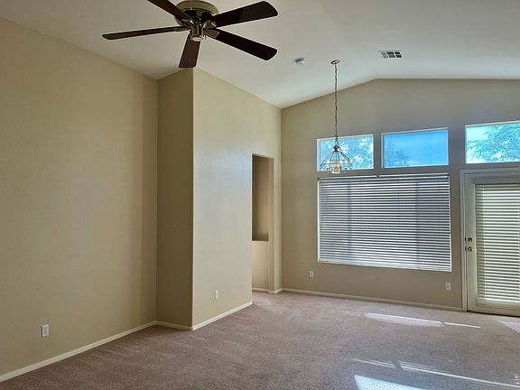 1273 sq ft, Single story, 3 bedroom, 2 1/2 bath, 2 car garage in the heart of summerlin. House features warm beige paint throughout, carpet and tile in kitchen and bathrooms. Kitchen has breakfast bar/counter, tile countertops, oak cabinets, new stainless steel appliances, tile floors, pantry & new LED recessed lights and dining nook. Living room has vaulted ceilings with ceiling fan and gas fireplace with media niche. Primary bedroom is separate from the other bedrooms and has ceiling fan & light, dual sinks, tub/shower combo and walk in closet. Bed 2 has ceiling fan & light. Bed 3 has ceiling light. Laundry with bifold doors and shelf. Front yard has desert landscaping and backyard has concrete patio and desert rock landscaping.