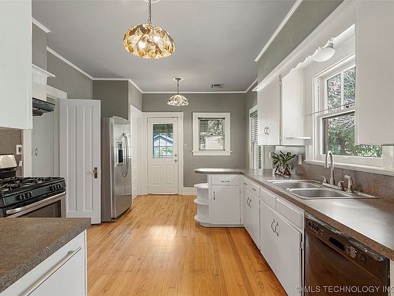 Gorgeous Updated in Swan Lake Historic District! AMAZING LOCATION by Utica Square, Cherry Street, Farmers Market and St. John Hospital. 9ft+ Ceiling Height, Charming Original Details, and Tons of Natural Light throughout. Brand New Hardwood Floors (2023). Large Bedrooms with Ceiling Fans. Upgraded Kitchen includes abundant storage, extended counter space with Bar Top seating, and bonus Breakfast Nook -or- Flex Room. Inside Laundry. Multi-purpose Basement with Half Bath could be converted to Wine Cellar, Studio, Workshop, Hobby Room, etc. Fenced Back Yard with Entertaining Deck & Storage Shed. Extended Driveway with Additional Parking and shared private entry/exit behind. XL Covered Front Porch with Bench Swing. Highly sought after neighborhood less than 2 miles from Brookside, Gathering Place, Woodward Park and Downtown Tulsa.