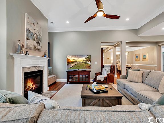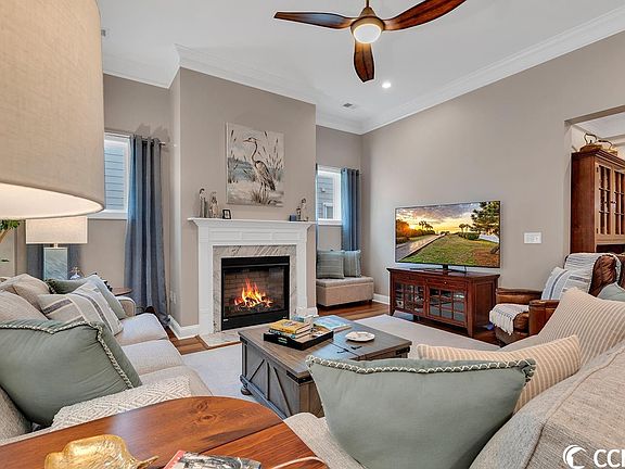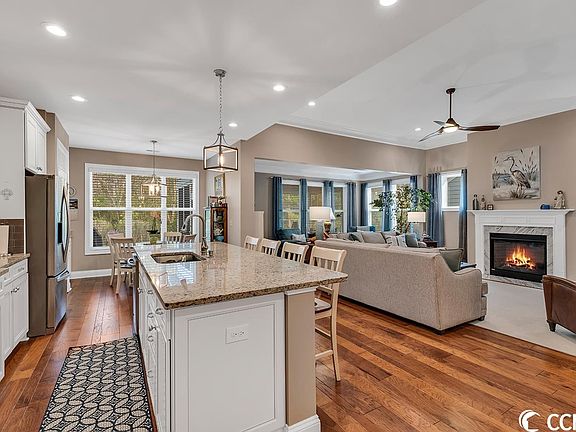 Immaculate 3 Bedroom + Flex Room (Office/Den/Bedroom), 2.5 Bath open concept home with a heated/cooled sunroom in Cresswind -desirable Market Common area. This home is the open "Oakside" floor plan and features a gourmet kitchen with a large eat-in island, breakfast nook, pantry, and bill paying/coffee station. Kitchen boasts granite countertops, stainless steel appliances, wall oven, and gas range. Open dining room is perfect spot for entertaining your guests. Enjoy morning coffee in the Carolina room- which overlooks protected woods on this premium homesite. Split bedroom plan gives guests/owner extreme privacy. Beautiful hardwood flooring in great room, flex room/office/bedroom, and primary bedroom. Gas fireplace in the great room. The primary suite features a spacious walk-in closet, a walk-in tile shower, linen closet, double vanity sink, and a separate dressing vanity area. Home upgrades include an extended two-car garage, utility sink in garage, a Whirlpool water purification home system, air filtration system, hurricane shutters, gutters/gutter guards, Ring doorbell, energy efficient tankless hot water heater and Carolina room with a mini split installed in 2022. Termite bond in place. Home was recently repainted neutral throughout, new designer lighting was installed, cabinetry added in the laundry room, and garage shelves installed. Lots of storage and a spacious attic area above the garage for holiday items and more. Patio is plumbed for gas making grilling easy. All appliances including washer and dryer, curtains/rods/window coverings and gas grill convey will sale. Cresswind offers a 12,000 square-foot Amenity Center that features an array of activities. There is a resort-style community pool, pickleball and tennis courts, an amphitheater, bocce ball and a state-of-the-art fitness center. Hop on your golf cart and drive to the beach in just minutes or go shopping in the beautiful boutiques in Market Common. Local businesses include: Grand 14 Theater, breweries, Barnes and Noble, Orvis, and a variety of restaurants. Walking and bike trails abound in the Market Common, and the drive to the Myrtle Beach International Airport is approximately 10 minutes. There are dog parks, bowling center and an Aero Par 3 Golf Course, an 84,000 square foot Veteran's Clinic, Doctor's Care and hospital emergency room, along with a Food Lion, Publix and Walmart, all at your disposal. The beautiful community of Cresswind, this gorgeous residence and the proximity to shopping and the beach makes this property a true gem! Square footage is approximate and not guaranteed. Buyer responsible for verification.