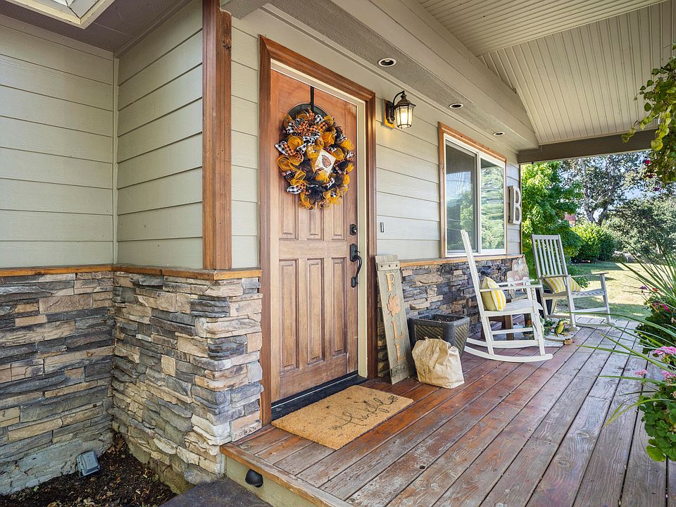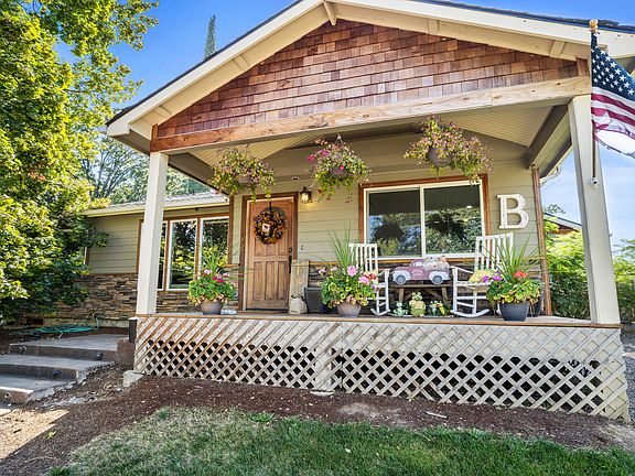 Superb East Medford location. Convenient to schools, shops, and highway yet very private setting. Relaxing covered front porch with circular driveway. This property is very ''homey''. Beautiful hardwood floors, stone surround wood burning fireplace with walnut hearth, vaulted ceilings, open floor plan, concrete kitchen counters with sit at bar, double ovens, gas stove top, large dining area, and split floor plan for privacy within the home. Main bedroom has completely remodeled custom tile walk in shower, rain shower head, and lots of storage. Out back provides retreat like covered patio, stamped concrete, fire pit and tons of privacy as no homes will be built behind the property. Detached 3 car garage with 220 power. Tankless water heater and gas heat help with utility costs.