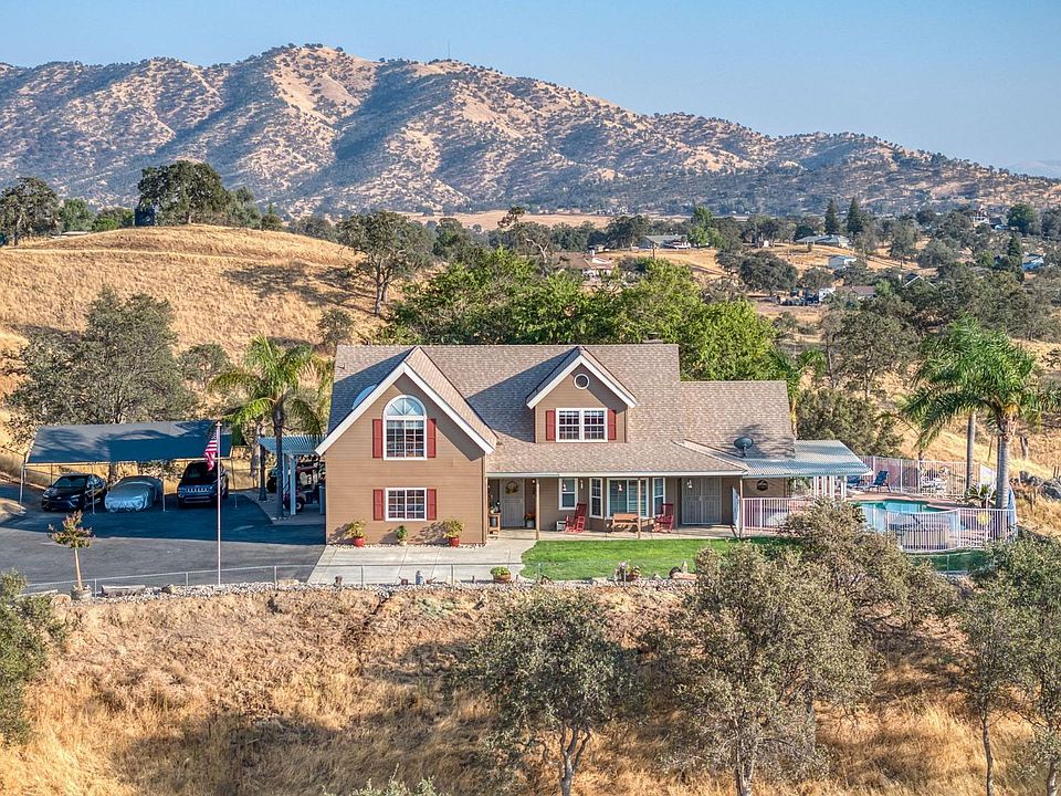 This stunning property has everything! Gorgeous top of the world views of the city and countryside from every angle of this oak studded 20+/- acre property! Updated throughout this custom home features 2640 sq ft with 4 bedrooms and 2.5 bathrooms plus an office! Granite countertops, upgraded bathrooms, laminate wood flooring, wood beams, French doors leading out to the backyard and pool area. Oversized covered back patio and front porch, fenced property, attached 2 car garage, detached 2 car shop, paved driveway & fireplace. The backyard is a relaxing retreat with lush landscaping, sparkling fenced pool, spa and covered areas to BBQ and entertain. Did I mention Owned Solar !!!!! This wonderful property provides Privacy with only a short drive to town.