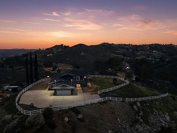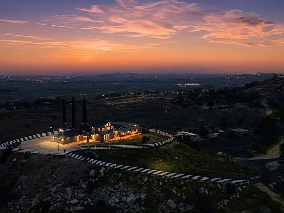 Perched atop approximately two private acres in the desirable Lake Mathews Estates, this stunning hilltop home offers breathtaking panoramic views of the lake, city lights, and surrounding mountains paired with exceptional privacy, usable land, and thoughtful upgrades throughout. This spacious 6 bedroom, 4 bath residence is ideal for large or multi-generational living, featuring dual primary suites located on separate levels, each with their own renovated private bathroom. The upstairs primary retreat enjoys direct access to a private balcony, perfectly positioned to take in sweeping lake and city views. At the heart of the home is a centralized, open kitchen designed for both everyday living and entertaining, offering generous butcher block counter space, a custom storage island, and a large utility style sink. The kitchen flows seamlessly into the dining area with original brick fireplace, breakfast nook, family bonus room, and an oversized living room framed by picture windows capturing the surrounding scenery. The interior showcases solid surface flooring throughout, including herringbone patterned tile and wood style laminate. Additional highlights include split ac units servicing individual rooms, mounted televisions, a dedicated laundry room/ pantry, and flexible sixth room currently used as an office that can easily convert to a bedroom or additional living space. Recent upgrades enhance both comfort and efficiency, including dual pane vinyl windows and sliders, updated HVAC, plumbing and electrical improvements, a composite roof, and a main septic system with an additional secondary system. The home is move in ready! Outside, the property continues to impress with multiple large, flat usable areas, ideal for animals, gardening, RV or trailer parking, a future ADU, shop, or expanded outdoor entertaining. The lower lot offers excellent versatility, while perimeter fencing, 9 exterior ring cameras and solar lighting provide added security and ambiance. A 2 car garage offers ample storage, and the newly paved road adds ease of access and value. While privately situated atop the hill, this serene retreat is conveniently located just south of Riverside, approximately 15 minutes from Corona, with access to both the 15 and 215 freeways offering rural luxury living without sacrificing proximity to nearby amenities. A rare opportunity to own a peaceful, view-filled estate with land, flexibility, and timeless appeal.