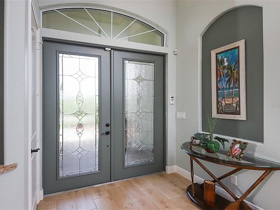 Come home to elegance! This STUNNING home has platinum builder finishes with no detail overlooked. As you enter from the paved walkway and beautiful etched glass double doors, your eyes will not know whether to take in the lovely WATERFRONT view or simply admire every tasteful aspect and decorating touch inside. The living room features built in shelves/entertainment center highlighted by unique stacked stone accents, electric fireplace and double tray crowned ceiling. The kitchen is a dream, with over 15' of breakfast bar and a separate island, with upgraded granite, cooktop, range hood, crowned cabinets, built in one touch draw microwave, wine fridge, amazing triple stained raise panel cabinetry with soft close doors and draws. Kitchen also boasts other designer touches such as plant shelves, more stonework and extensive crown molding...truly a chef's delight! In the adjoining dining area you are surrounded by glass and zero corner glass doors which give you uninterrupted views of the beautiful lanai and waterfront. A hallway leads to the guest bedrooms providing an easy flow in this split bedroom floorplan home. The guest bath features stunning tile and leatherette granite countertops. The master suite is comfortable and welcoming, with a fabulous en suite bath featuring a walk-through shower, dual vanities and more leatherette granite countertops. As you would expect, outdoor living is nothing short of fantastic on this large southern exposure paved lanai with a 24' heated salt water pool and spa, outdoor shower, "no-see um" screening, covered area for dining and open areas for sunning including a raised level for planters. Walkways along the side of the home and cleared gravel back yard with stepping stones provide a pristine look and lead to the dock and boat lift. You'll only need your cooler to set out for the Gulf and beyond! Per homeowner, there is approx. 9' clearance at bridges and shallowest point of the waterway approx. 4'. The floors throughout the home are wood look porcelain tile, wall paint in tasteful decorator colors and include chair rails, crown molding, crowned tray ceilings, top of the line faucets/fixtures, travertine tile window sills, under cabinet lighting - as we mentioned these are first class finishes that go on and on. On the practical side, this home has full impact glass for hurricane protection and an additional accordion shutter to close off the lanai, manabloc plumbing, gutters all around, floritam grass, stone and paver walkways, batt insulation above, epoxy floor in garage, new sprinkler pump 2020, new pool pump 2020. Whether entertaining in style or just spending precious time with family, this home fulfills every wish. This is truly a move in and enjoy opportunity. We invite you to view the attached video and photos and schedule your showing to truly appreciate this property.