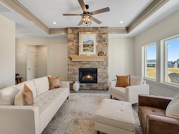 This like-new gorgeous villa was custom built by Quality Crafted Homes. Located in upscale Timber Ridge subdivision, this charming home is filled with top-end details and situated on a quiet cul-de-sac lot. Convenient access to Pufferbelly Trail. The home has amazing curb appeal with an inviting front porch, professional landscaping & new trees planted by Arbor Farms. Featuring a 3 bedroom split floor plan with an open concept that makes entertaining a breeze. The Great Room provides a tray ceiling with crown molding, a gorgeous floor-to-ceiling stone gas log fireplace and large windows that fill the space with plenty of natural light. Cooking in this gourmet Kitchen is any chef's dream with quartz countertops, ceramic tile backsplash, Stainless Steel appliances plus an oversized walk-in pantry! The master en suite off of the Great Room features quartz countertop dual vanities, a beautiful ceramic tile walk in shower and a spacious closet. Enjoy the patio space out back with the most amazing sunsets and your very own fresh cut flower garden. This beautiful home is in pristine condition and move-in ready.