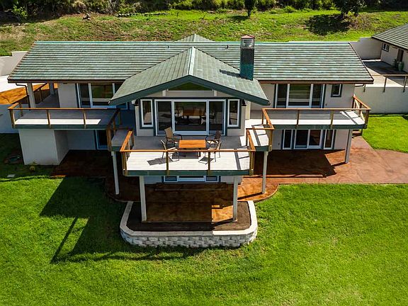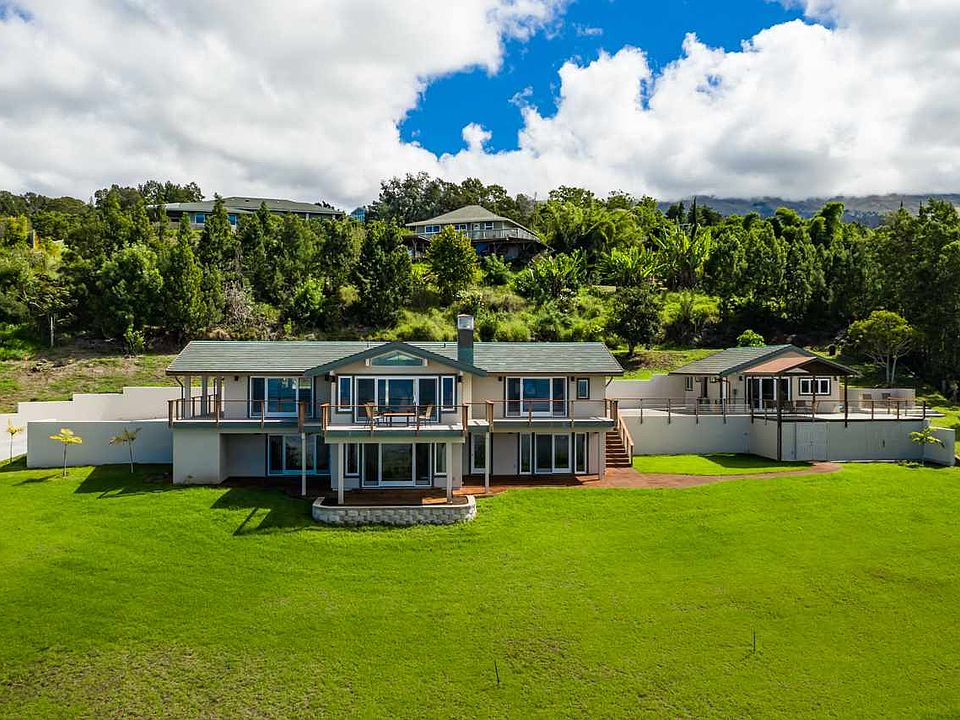 Completely & meticulously renovated in 2020, this approximately 3,079 s.f., 3 bedroom, 3.5 bathroom custom residence offers the quintessential Kula bi-coastal view experience! The stucco exterior walls & the glazed ceramic roof tiles, plus the copper gutters & downspouts, set the bar regarding quality. The elegant solid walnut front door is accentuated with finely detailed aluminum channels; a design theme present throughout the home. Upon entering, you are mesmerized by the compelling view of the West Maui Mountains, North & Southwest Coastlines, & the expansive Central Valley below. You will enjoy lofted white-washed ceilings, limestone floors, & recessed LED & custom pendant art lighting in the great room & kitchen/dining areas. Elegant warm-toned, soft-close, kitchen cabinets are juxtaposed with rich patterns of the fusion quartz center island, perimeter countertops, & full-height backsplash! There are brand-new stainless steel Bosch appliances, ample pantry space, & built-in wine cooler & wine rack. Wrapping around the kitchen, great room, & primary suite are spacious lanai areas with Ipe wood & stainless steel cable railings. The walnut-framed, book-matched, fusion quartz fireplace is a masterpiece! The elegant stairway to the lower level den & two bedroom suites features a Carrera marble hand-rail that adds a touch of elegance. All bathrooms feature under-lit furniture style cabinetry, porcelain tiled walls, & custom glass feature tiles, along with stone floors & quartz counters. A walnut feature wall adds warmth to the lower level den area, which also enjoys panoramic views. The Ohana finishes are consistent with the main house. There is a large motor court area & ample parking. There is also a significant amount of enclosed storage space. Enjoy life in stunning upcountry Maui!