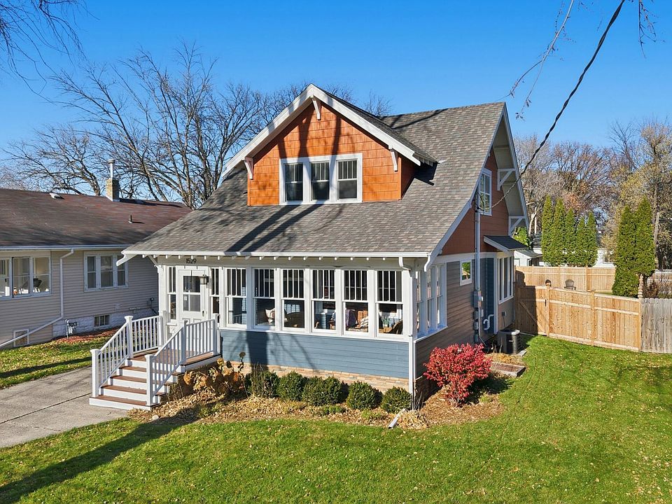 This beautifully maintained home is full of character and ownership pride. Lovingly restored to honor its original 1920s Craftsman design, every detail has been thoughtfully considered to blend historic charm with modern comfort. Step inside the cozy, three-season front porch that is perfect for morning coffee or evening relaxation. The stunning original hardwood floors have been refinished, and the living room’s built-in bookshelves add to the home’s warm character. A formal dining room features custom blinds and opens to the fully fenced backyard. Completing the main level is the kitchen with a tin ceiling and a pantry for additional storage. Upstairs, you’ll find three bedrooms, including a primary with two closets, and a newly remodeled full bathroom. The finished basement provides extra living space with a family room, bathroom, and laundry area. Enjoy outdoor living with the maintenance-free back deck, mature landscaping, a cedar privacy fence, and a fire pit area. The garage is insulated and heated. The two-stall tandem offers access from both the street and the alley. It is oversized, providing plenty of storage space. Additional updates include: Roof, Windows, and LP Smart Siding (2015), New Boiler (2022), Basement Braced and Drain Tile Added. This is a truly special property that perfectly balances historic craftsmanship with modern updates. Schedule your showing today!