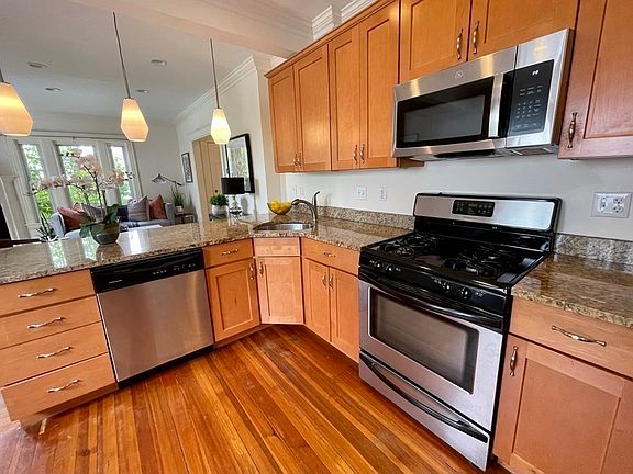 Gorgeous first floor condo in two family home with 2 bedrooms and 1 bath with many renovations in 2010. Contemporary open floor plan with high ceilings, recessed lights and wood floors. Living room with gas fireplace. Gourmet kitchen with maple cabinets, stainless steel appliances (refrigerator, dishwasher, gas stove with built-in microwave above stove), granite counters and spacious breakfast bar. Basement has washer/dryer and plenty of extra private storage. Relax and enjoy private rear yard with brand new wooden fence. 2010 updates from condo conversion include: Newer electrical, Hydro Air by gas for heating and central air conditioning. Pet friendly. Off street parking for one car and plenty street parking as well. Conveniently located in the West Roxbury/Roslindale neighborhood line near the bustling shops/restaurants of West Roxbury Center and Roslindale Village. Easy commute to Longwood Medical Area, Arnold Arboretum and commuter train to Downtown Boston!
