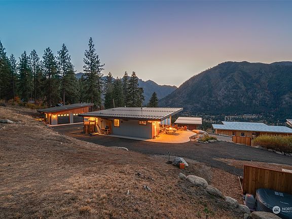 Rare one-of-a-kind luxury property, where unmatched beauty & modern sophistication meet. Perched on one of the most coveted lots in the area w/unobstructed panoramic views of Leavenworth & Enchantment Mountains. Inside, you'll find a perfect blend of modern rustic elegance, w/soaring ceilings & exposed wood beams creating a warm, expansive atmosphere. High-end finishes & heated bathroom/shower flooring add to the lavish feel. Adorable bunk shed provides ample room for guests while the private sauna gives you a place to unwind w/a serene, spa-like experience. Boasting an 840 Sq. Ft. garage, 3 bed septic system AND architect-designed, ready-to-build renderings for a Primary Bedroom w/Ensuite, offering seamless expansion possibilities.
