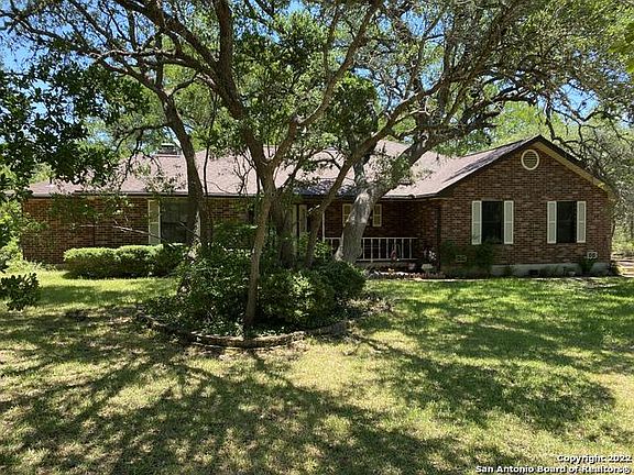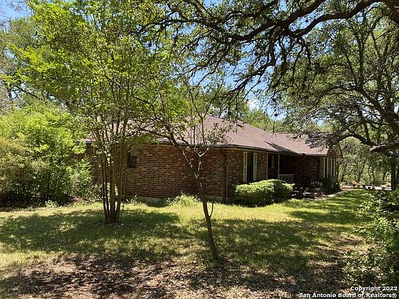 Make this lovely 5 Acre property with all brick home in the fantastic town of Bulverde yours today. This ranch style home features a newer roof, tiled covered patio, and two car side entry garage. Enter into your family room with vaulted wood beamed ceiling and wood burning fireplace. The floors are laminate and ceramic tile. Don't miss the pocket door from the family room to the secondary bedrooms. There is no carpet. The kitchen has granite counters and breakfast bar. Built in desk area. The stainless appliances are newer and include a built in microwave and smooth top stove. Walk in pantry. Split primary bedroom with double french doors that go to the patio. Master bath has separate whirlpool tub and shower with bench and double vanities with granite counters. Double closets. Art ledges. There is an additional 1/2 bath in the garage and a deep sink. Built in floor safe. This gated property is quiet and serene and covered with mature trees including Oaks, Persimmon, Elm, Crepe Myrtles, Texas Lilac, a nectarine and pear tree. Sprinkler system and water softener. No HOA. A metal building and a workshop with electricity and garage door are part of the property. Original owners still have the plans to the house. Bring your horses and cows. Riding lawnmower with trailer is negot.