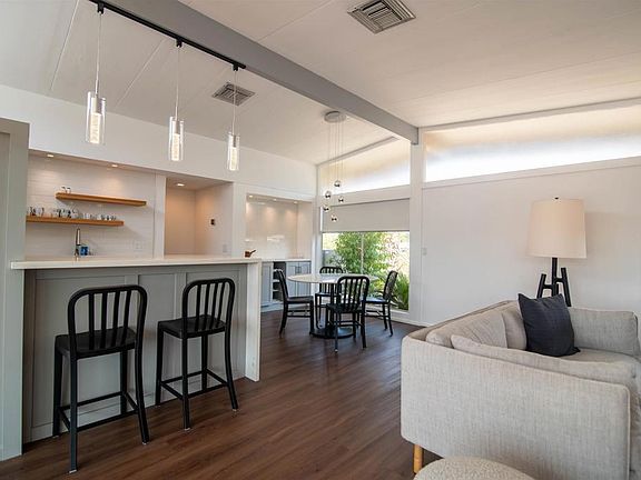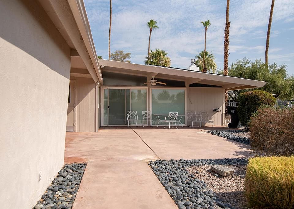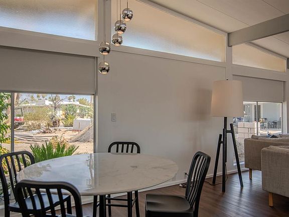 Mid-Century Modern and updated de Anza Fairway Cottage, designed by Borrego Springs and Julian architect Richard Zerbe, offers privacy and views of the golf course, mountains, and is short walk to the clubhouse, exercise facility, and first tee. These Fairway Cottages are highly prized by their owners and rarely become available. Its open floor plan blurs the lines between indoors and out. The kitchen features updated stainless steel appliances, solid surface countertops and ample storage plus a pantry. The living room has high ceilings, newer carpeting and two walls of windows as well as a gas fireplace. Remodeled bathrooms with granite countertops. Both bedrooms have en-suite bathrooms and are located at opposite sides of the house for extra privacy. The large outdoor patio is a great place for entertaining, relaxing and enjoyment of the dark skies and desert landscape. Inviting pool shared with only 3 other units. Leased Solar