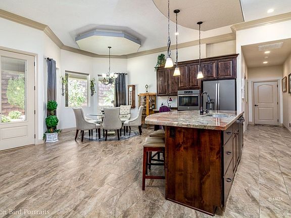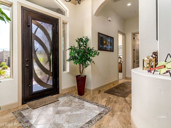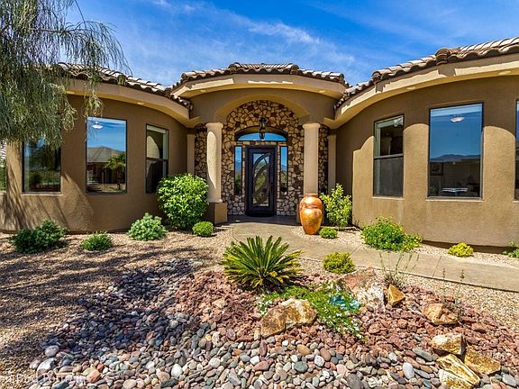 Bella Horizon is a Gated Community with one of its eastern borders being the "Wolf Creek Golf Course". Beautiful Custom "Wrought Iron Door" begins to tell the story of what is to unold inside this home....11 foot ceilings with specially designed "drop ceilings" over the kitchen and dining area that add a contemporary flair to this home. Kitchen offers an immense "center island" perfect for entertaining, gathering,food preparation and yes "seating for four". Kitchen has sutle "slate appliances" along with a walk-in pantry. Great Room has an electric fireplace surrounded with decorative niches and crown molding. Master Suite will spoil you with a jacuzzi tub and walk-in tiled shower. Both guest bedrooms have "eye popping arched bay windows" that bring in natural light with east facing views of the mountains. Bonus Room has french doors with entry into the garage. Garage has A/C and Heating...($7,200). New Solar Panels ($32,000). Looking for privacy...it is all here. Backyard is quite a show place accented with palms, astro turf and your own PUTTING GREEN . Covered back patio is very spacious. Ask about power bills that hover around $30 a month for a home 2568 feet