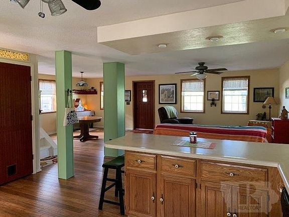 One of a Kind!Beautiful inside and out! This lovely & unique home is located at the edge of town and features an open floor plan on main level, 3 BR up with open stair way, full basement with walk-out to lower level patio! Large storage building, fantastic views and mature timbered lot! A walking bridge to the more closely timbered area provides hours of entertainment for adults and children alike! Large 2 car garage!