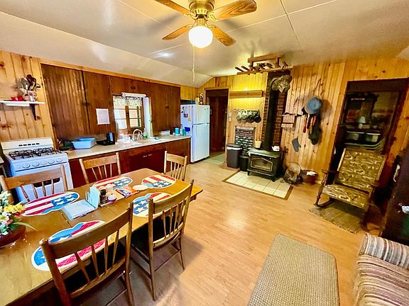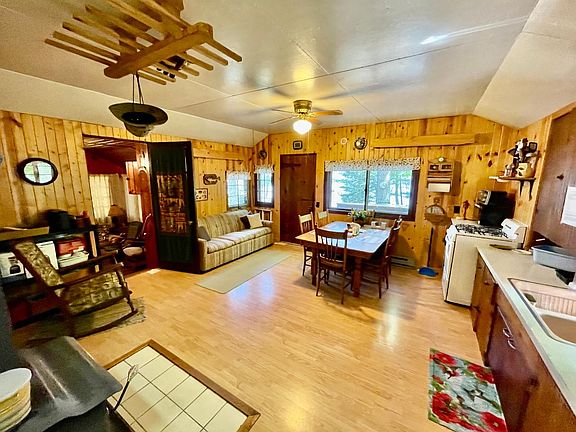 Oh, my what a spot! This cabin sits on 11.79 acres of wooded land on Long Lake of the Three Lakes Chain of 28 Lakes! It sits in a quiet bay and has approximately 396' of frontage. It has its own peninsula and is located at the end of the road. The elevation between the home and the lake is gentle and the view is spectacular!