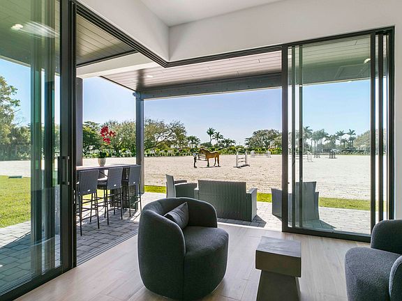 Equipped for professional training and competition, the state-of-the-art barn features 12 stalls, tack and feed rooms, several storage areas, a lounge, round pen, covered walker and direct access to large grass paddocks. The "ebb and flow" oversized arena offers premium footing for year-round riding, while the property's layout provides effortless movement between barn, arena, and turnout areas. In addition, the property features an oversized double garage/storage with two independent grooms' quarters.