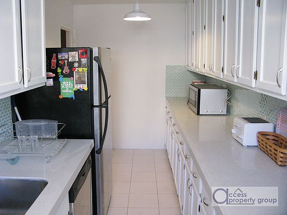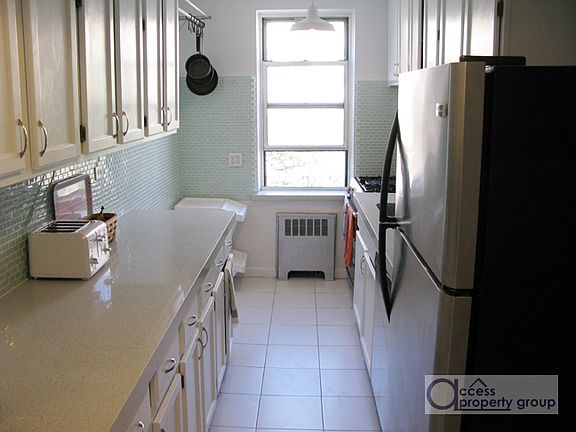 PEACEFUL SERENITY! the zen of this beautiful home descends on you immediately as you enter; with the sunlight pouring in every window and the lovely sound of birds outside, you feel swept away into your own little universe of calm walking in the door. the sense of privacy starts at the entrance, where a hallway with three large closets hides the rest of the apartment behind a corner. turning that corner reveals a sunny, serene foyer/living room combo overlooking a quiet, tree-lined block. the ginormous kitchen adjacent to the foyer has been freshly updated with AMPLE white cabinetry, practically endless quartz counters, and lovely acqua glass-tile backsplash complementing the stainless steel appliances. the generous bedrooms are nicely separated from the living area for privacy, and the simple white-tiled bathroom with white fixtures is nestled conveniently in between. the building is located within just a few minutes' walk to two trains and amenities, and as a major bonus, it features a highly coveted garage. if you are looking for a quiet escape easily accessible to lower manhattan, you can stop your search right here.....