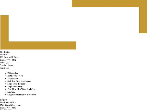 Apartment Description: Contact us for more information or apply online to begin the leasing process. Building Description: Located just off of the Grand Concourse, the Ross is situated in a perfect location of South Bronx apartments and still just minutes away from Manhattan. The Ross stands right around the corner from the beautifully-designed Bronx Museum of the Arts, which exhibits unique artwork and attracts people from all over New York. Our building is also situated near the newly-built Yankee Stadium - a major attraction for locals and tourist. Residents can also easily access nearby supermarkets, malls, and adjacent parks.