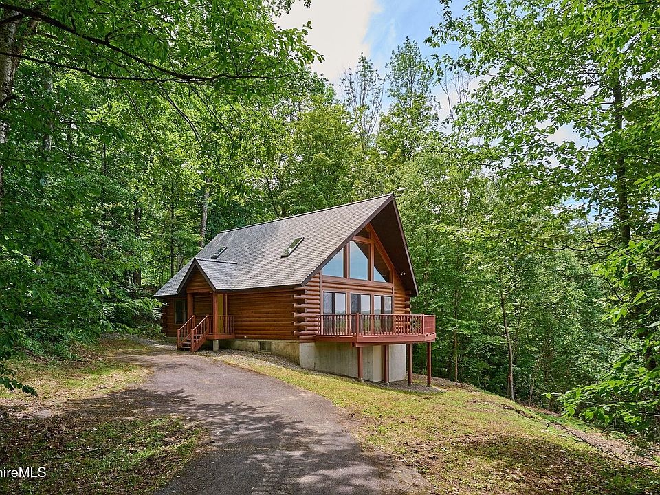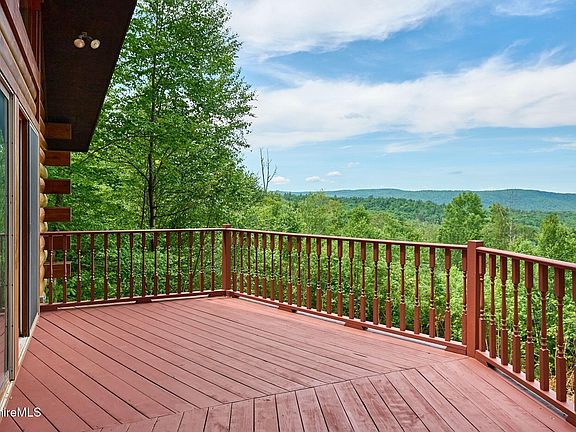 Experience the best of log home living on this picturesque 112-acre countryside getaway, ideal for outdoor enthusiasts and nature lovers alike. Surrounded by stunning mountain views, the property features a network of wood roads, seasonal streams, and abundant wildlife creating a peaceful haven. Located just minutes from Berkshire East Resort, offering downhill skiing & mountain biking, or enjoy the scenic Deerfield River, known for excellent fishing and whitewater rafting. With endless opportunities for year-round recreation, this property is a true four-season retreat. Inside, the spacious great room welcomes you with a cathedral ceiling & sliding glass doors that frame breathtaking views. The open kitchen and dining area seamlessly connect to the living space and a generous deck, perfect for entertaining or relaxing. The upper level offers a bedroom, full bath, and a cozy loft. The main level includes two bedrooms, a full bath and there is a full walkout basement & new roof in 2023.