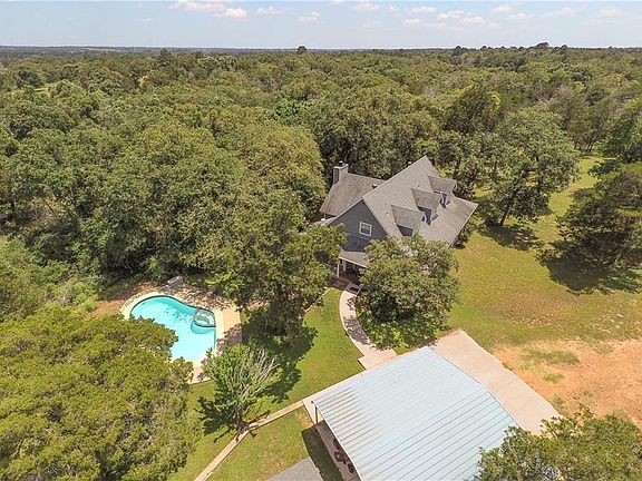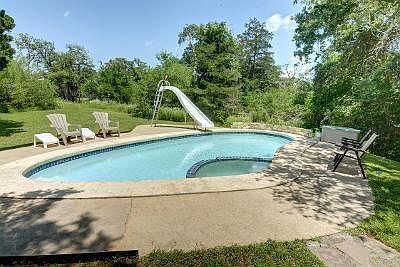Beautiful setting nestled in majestic oak trees! This country home has a wrap around porch, deck, beautiful in ground pool with slide! In the living room the stone fireplace is floor to ceiling (approx 20 ft high) with a wall of windows overlooking the beautiful greenbelt! Lots of cabinets and counter space in the kitchen. There is a shooting range set up or it could be a private picnic area! Master down with large walk in closet, spacious bath! There are 2 bedrooms up w/jack & Jill bath & computer area. Only 25 mns to ABIA!