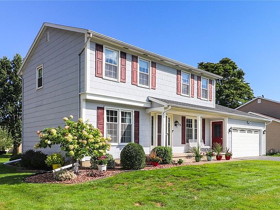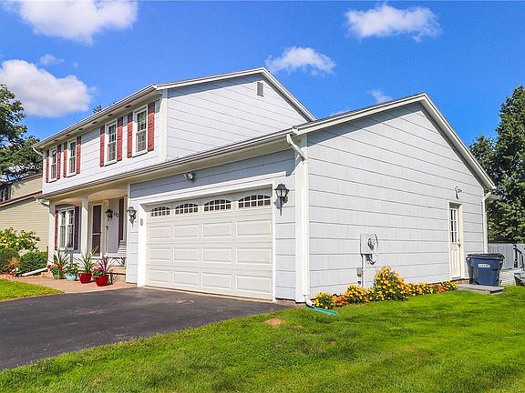 Don't miss out on this charming colonial home in Greece! Inside, you'll find a classic floorplan with a bright, spacious dining room on one side of the entrance and a roomy living area on the other. Both spaces flow into the sunny eat-in kitchen, where you can set up a casual dining table by the bay window for breakfasts, homework, or card games. The kitchen boasts white cabinets with ample storage and matching stainless steel appliances. Looking for extra living space? This home offers a lovely 4-season room with vaulted ceilings, plenty of sunlight, and a view of the backyard, adding 132 sq. ft. of versatile space. Upstairs, discover two generous spare bedrooms, a hall bath, and a spacious main bedroom with an attached en-suite. The mostly finished basement serves as a great game room and rec space, with ample storage and a convenient laundry area. When the warm weather arrives, enjoy outdoor living on your deck or by the pool, basking in the sunshine. Recent updates include a newer hot water tank and a roof replacement last year. Don't miss the chance to make this your dream home!