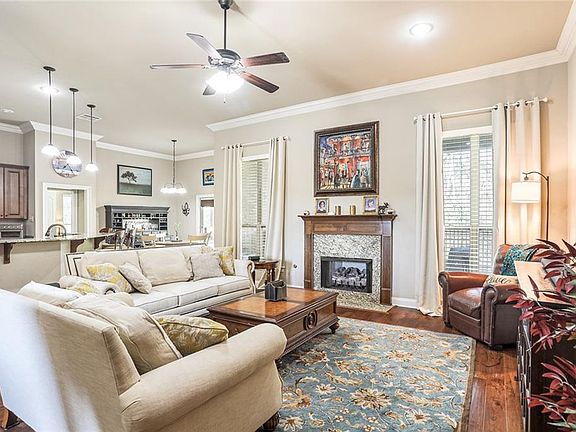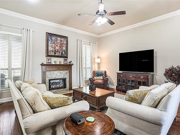 Lovely, well maintained home nestled comfortably at the end of a cul-de-sac. Greenspace in rear provides a tranquil backdrop & oversized rear yard provides plenty of room for the pool of your dreams. Open concept adds a spacious feel. Trey ceiling in Primary BR, Gas FP, wood floors. in Den & Study. Granite counters, pendant lights & SS appl. in Kitchen. Ceiling fans throughout. Amenities incl. patio fan & gutters. Neighborhood has lovely live oaks, community pool, playground and clubhouse.