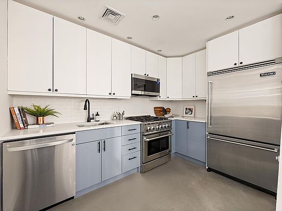 On the main level, you're welcomed by a spacious, open-concept living and dining area with a newly renovated chef's kitchen and striking poured concrete floors throughout. Outfitted with top-of-the-line appliances-including a DCS five-burner gas range, a 36-inch Viking professional refrigerator with an icemaker, and an LG dishwasher-this kitchen is as functional as it is beautiful, offering plenty of custom cabinetry for storage and elegant quartz countertops for prep. Enjoy an oversized living room perfect for comfy furniture, and an ample separate space for formal dining. Host dinner parties and holidays and have room for everyone at the table! There is even a full bathroom on this level should you choose to include a pullout sofa for overnight guests. The full bath on this level has been recently renovated and features Kohler fixtures, a deep soaking tub and shower, and classic black and white palette.