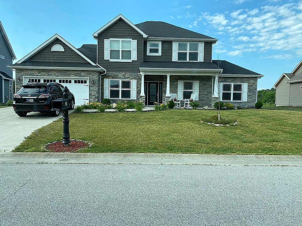 LESS THAN 2 YEARS OLD, Modern home on a coveted pond lot in desirable Harrison Highlands. The full view glass front door leads to the two story foyer, formal dining & dramatic curved staircase w/ wrought iron railing. The open floor plan flows to the spacious great room w/ beautiful hardwood floors, gas fireplace, & triple windows allowing natural light & views of the private footbridge leading to the stocked fishing pond. You'll be in awe of the chefs kitchen w/ gas cooktop w/ pot filler, ss range hood, 2 dishwashers, large island w/veggie sink, wine fridge, wall oven/micro combo, and an abundance of cabinets topped w/ quartz countertops and subway tiled backsplash. The 1st floor master suite will not disappoint w/tray ceilings, custom built-ins in the large WIC, large soaking tub, and tiled shower w/ rainfall shower head and double body spray jets. Upstairs you'll find 3 well sized bedrooms w/ ceiling fans, functional loft area, & full bath w/ double sink vanity. Want more? Enjoy the enormous laundry room w/cabinets, sink & folding table, whole house Aquasana water filter, large patio, covered porch w/ ceiling fan & craftsman style stone pillars, gas line for your grill, & Rubbermaid storage shed.