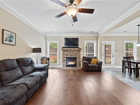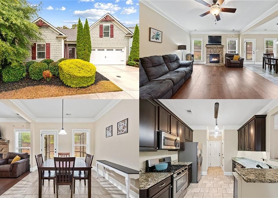 Refined single-level living in Lantern Walk. This impeccably kept 4-bedroom, 2-bath ranch welcomes with a grand, open living room anchored by a gas fireplace and effortless flow to the dining area and chef’s kitchen. A generous walk-in pantry keeps the kitchen pristine and organized for everyday ease or elegant entertaining. The serene primary suite is a true retreat, offering a spacious walk-in closet and a spa-inspired bath with dual granite vanities, a soaking tub, and a separate walk-in shower. Three additional bedrooms provide flexibility for guests, office, or fitness. Step outside to a screened porch overlooking a private, fenced backyard—perfect for quiet mornings or alfresco evenings. A large 2-car garage affords abundant storage and utility. Enjoy low-maintenance living with HOA including front-yard mowing. Moments to downtown Ball Ground’s boutiques, home stores, restaurants, and brewery, with swift access to I-575 for effortless commuting. Served by Cherokee County schools, this residence blends elegant comfort with exceptional convenience. Schedule your private tour today!