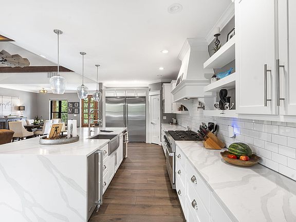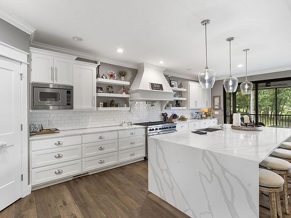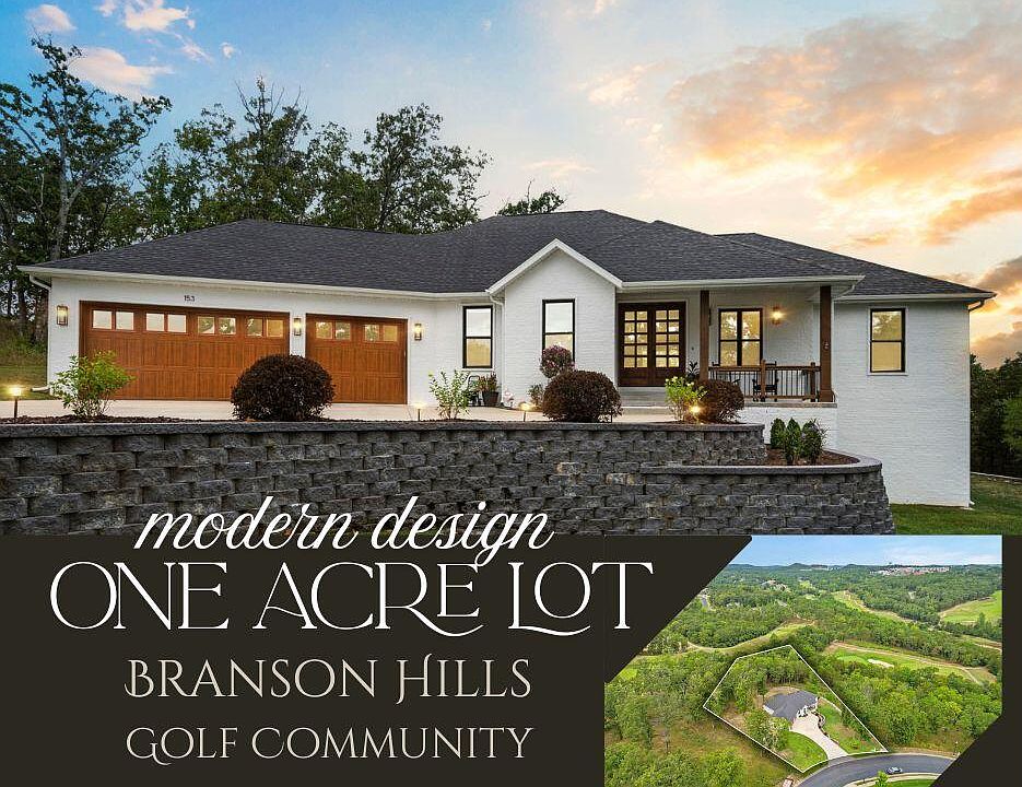 LUXURY-MODERN-GATED- This walkout basement home on Pinehurst Drive is perfectly positioned on over an acre in Branson Hills Estates, offering incredible golf community amenities, views of the Ozark mountains and mature trees. From the moment you step through the grand double doors, you'll be welcomed into a thoughtfully designed, open-concept floor plan ideal for entertaining. The gourmet kitchen is a chef's dream, showcasing quartz countertops, a massive 10-foot waterfall island, Viking professional-grade appliances, Sub-Zero refrigerator, built-in ice maker, custom shaker cabinetry, and a walk-in pantry. Your owner's suite is a true retreat with a spa-inspired bath featuring a soaking tub, tiled walk-in shower, and spacious closet. Vaulted ceilings with exposed beams and a custom-designed laundry room with lockers and hampers add both style and function. Elegant and functional built-in's with no expense spared on the California Closets(tm). The perfect spot to sip morning coffee can be found just steps outside the kitchen in the screened in covered porch. Enjoy outdoor grilling on the open deck that overlooks the golf course. Three bedrooms on the main floor with two additional bedrooms downstairs, a full bath with double sinks, a media room, a fitness space, and a convenience kitchen/wet bar with open shelving and storage. Throughout the home, you'll notice meticulous craftsmanship, from LVT flooring and black Andersen windows to quartz surfaces, custom garage doors, and elegant crown molding. No detail has been overlooked in this luxury modern farmhouse. Don't miss your chance to own one of Branson Hills' most stunning properties.