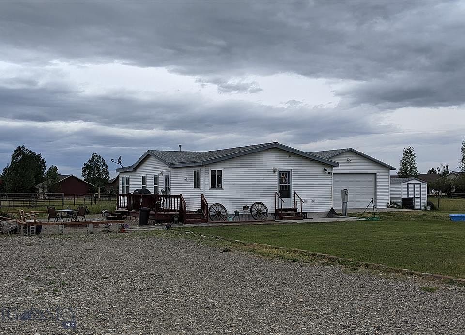 Panoramic views of the mountain ranges. 2.5 acres of a newly developed horse property with pipe fences, horse shelters, automatic waterers. Three bedroom, 2 bath detitled manufactured home that has many updates, on a permanent foundation with a two car detached garage. Private well and septic. Great property in a good location. Located just west of Belgrade. A great property...bring your horses or 4-H animals.